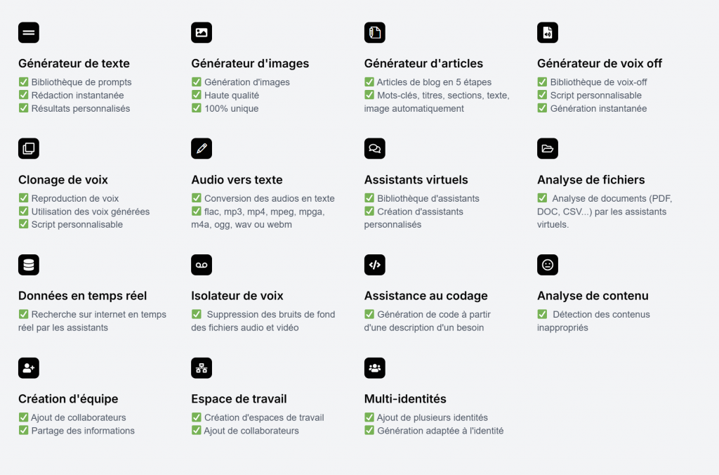 Une plateforme IA de création de contenu, offrant +10 fonctionnalités pour générer du texte, images et audio en quelques clics.